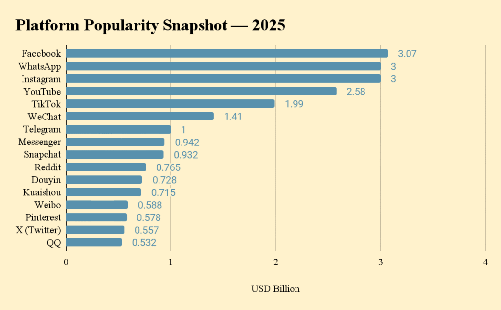 Social media today is a mix of communities, creators, and commerce. Here’s how usage looks across platforms: